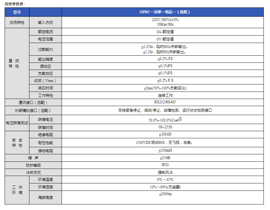 | GPDC系列是一款工業(yè)級(jí)高精度的可程控直流電源,成功結(jié)合了脈寬調(diào)制技術(shù)(PWM),每臺(tái)設(shè)備均配備了西門(mén)子等國(guó)外IGBT核心執(zhí)行元件,大功率機(jī)器采用結(jié)構(gòu)均流技術(shù),并配以各種完善的保護(hù)功能,是一種性?xún)r(jià)比優(yōu)異的直流電源產(chǎn)品。該系列可zui高輸出電壓2000V、zui大輸出電流2000A,可選配通訊接口、觸摸屏和程控功能等,方便使用人員模擬更復(fù)雜的測(cè)試條 |